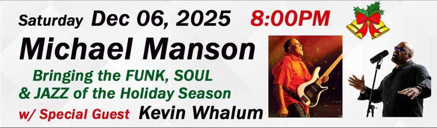 Saturday December 06, 2025 Bassist Mike Manson Funky Holiday Show w special guest singer Kevin Whalum, New Year's Eve Super Show to Ring In 2026 December 31, 2025 with Saxophonist Paul Taylor, Vocalist Lindsey Webster, Keyboardist Brian Simpson, Flautist Kim Scott, Guitarist Gerey Johnson, Saturday February 14, 2026, Two Valentine’s Day Shows Motor City Bands’ Motown Revue & Shining Star Band’s Tribute to Earth Wind & Fire, May 9th, 2026